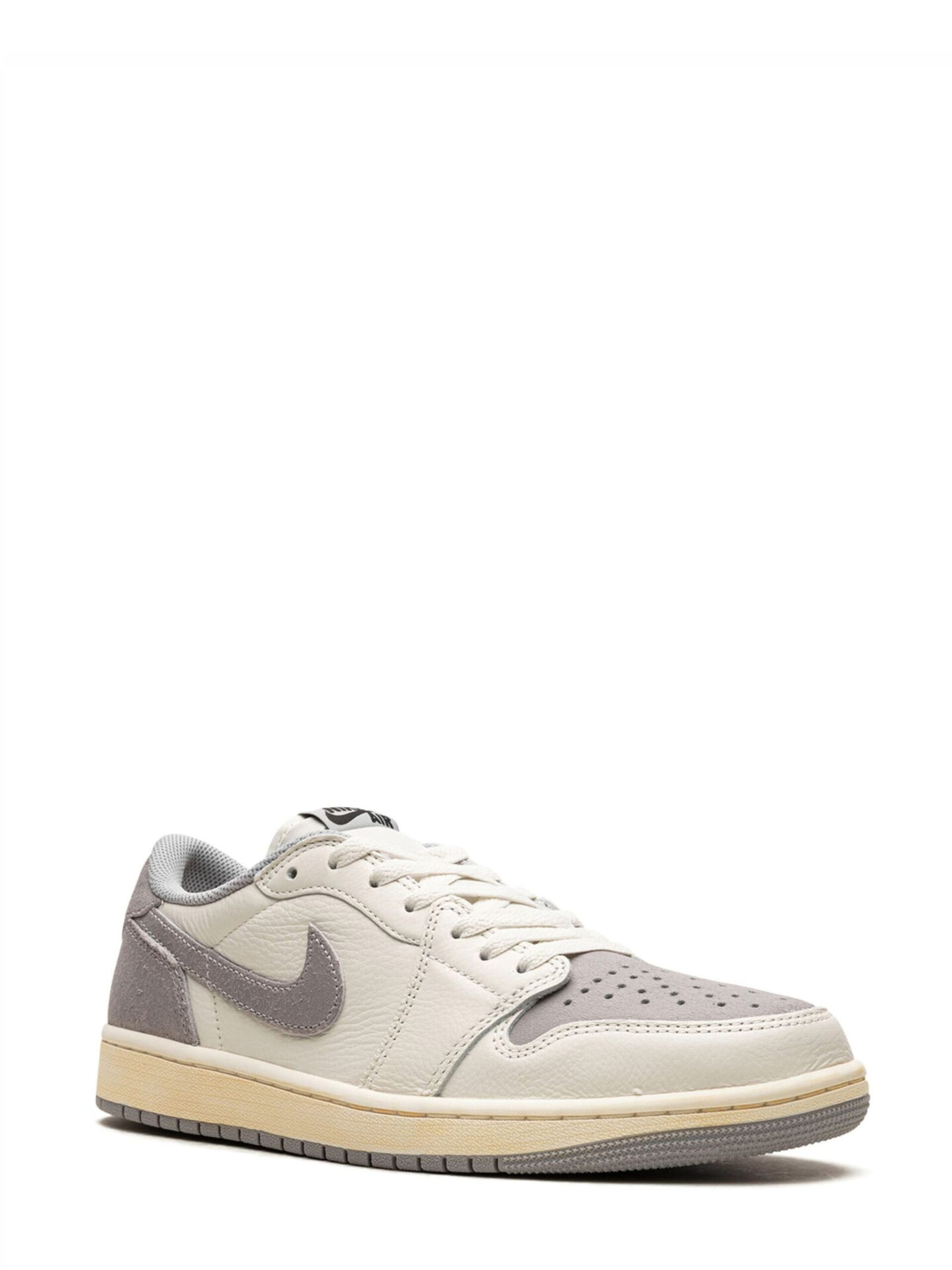 The Jordan 1 Retro Low OG Atmosphere Grey is a low-cut basketball-inspired sneaker that features a minimalistic design. It is constructed using premium materials, including a mixture of genuine leather and synthetic material.
