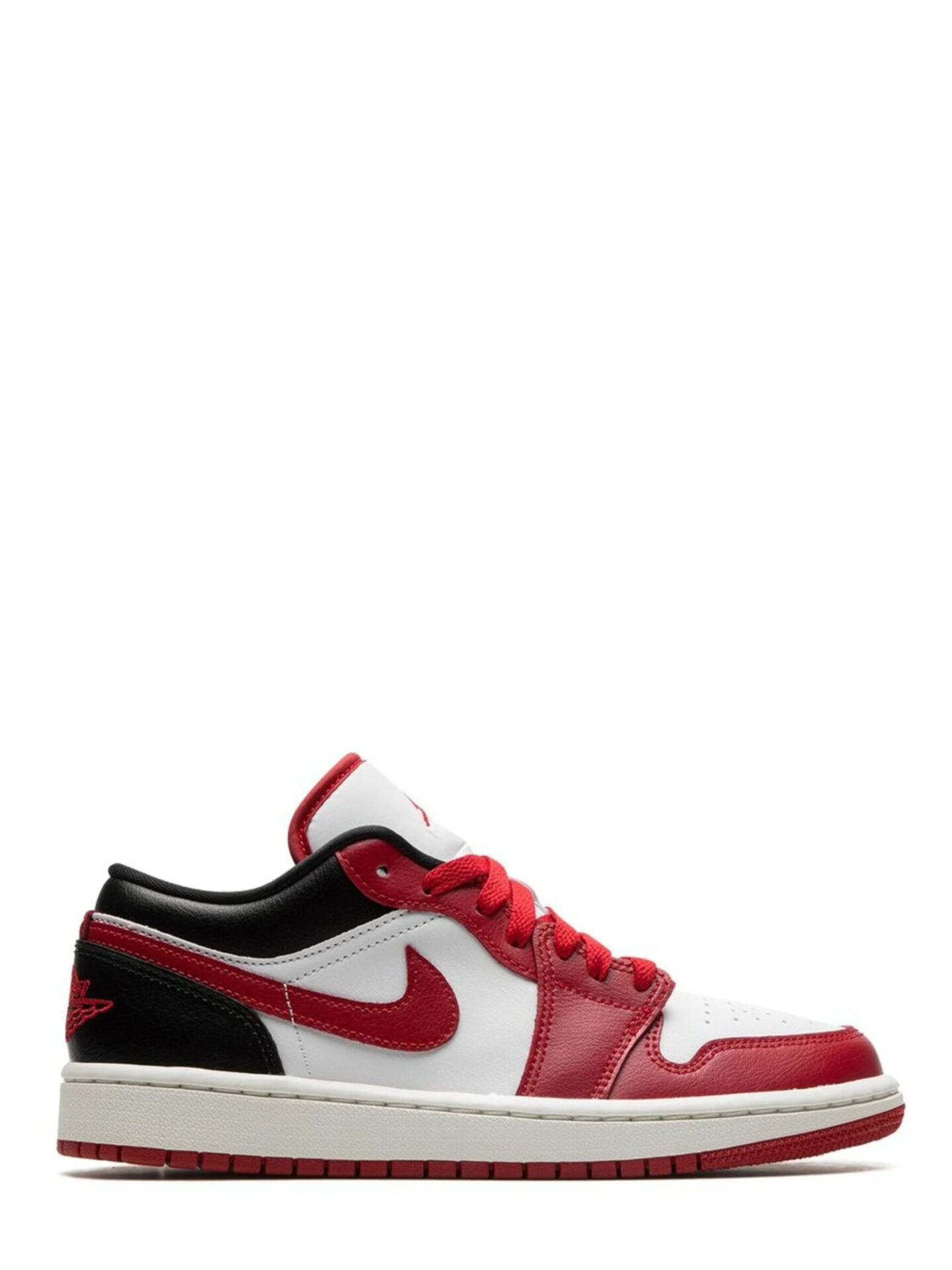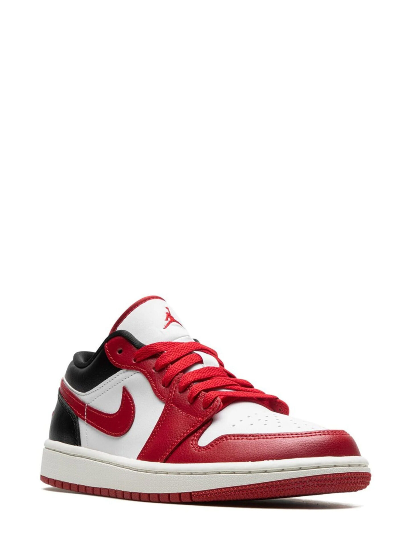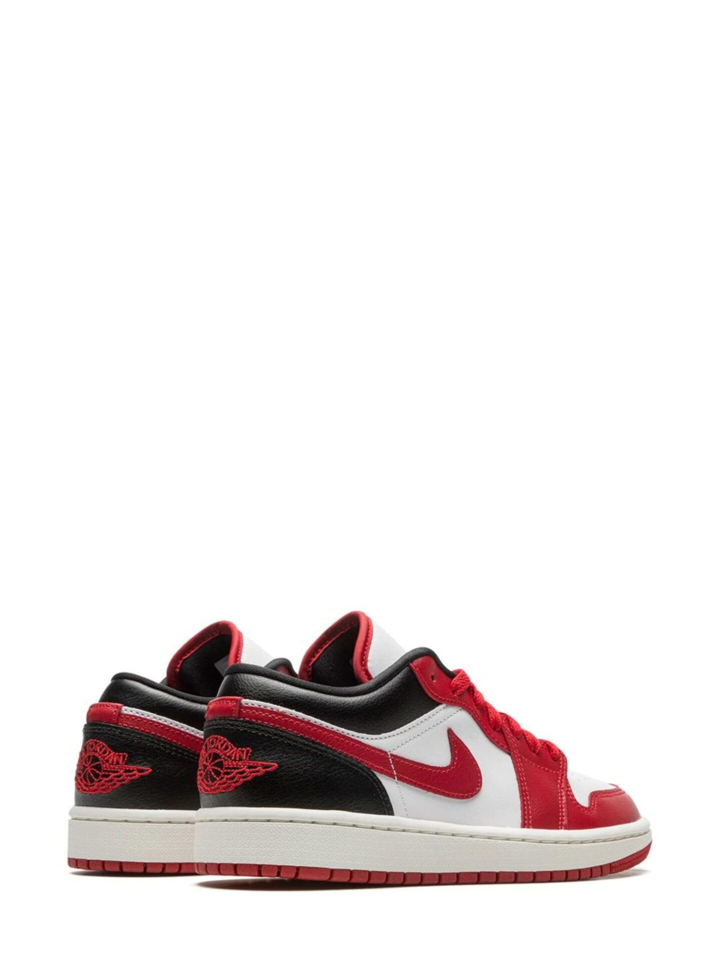 The Air Jordan 1 Low Reverse Black Toe arrives in a white, black, Sail, and Gym Red color palette.