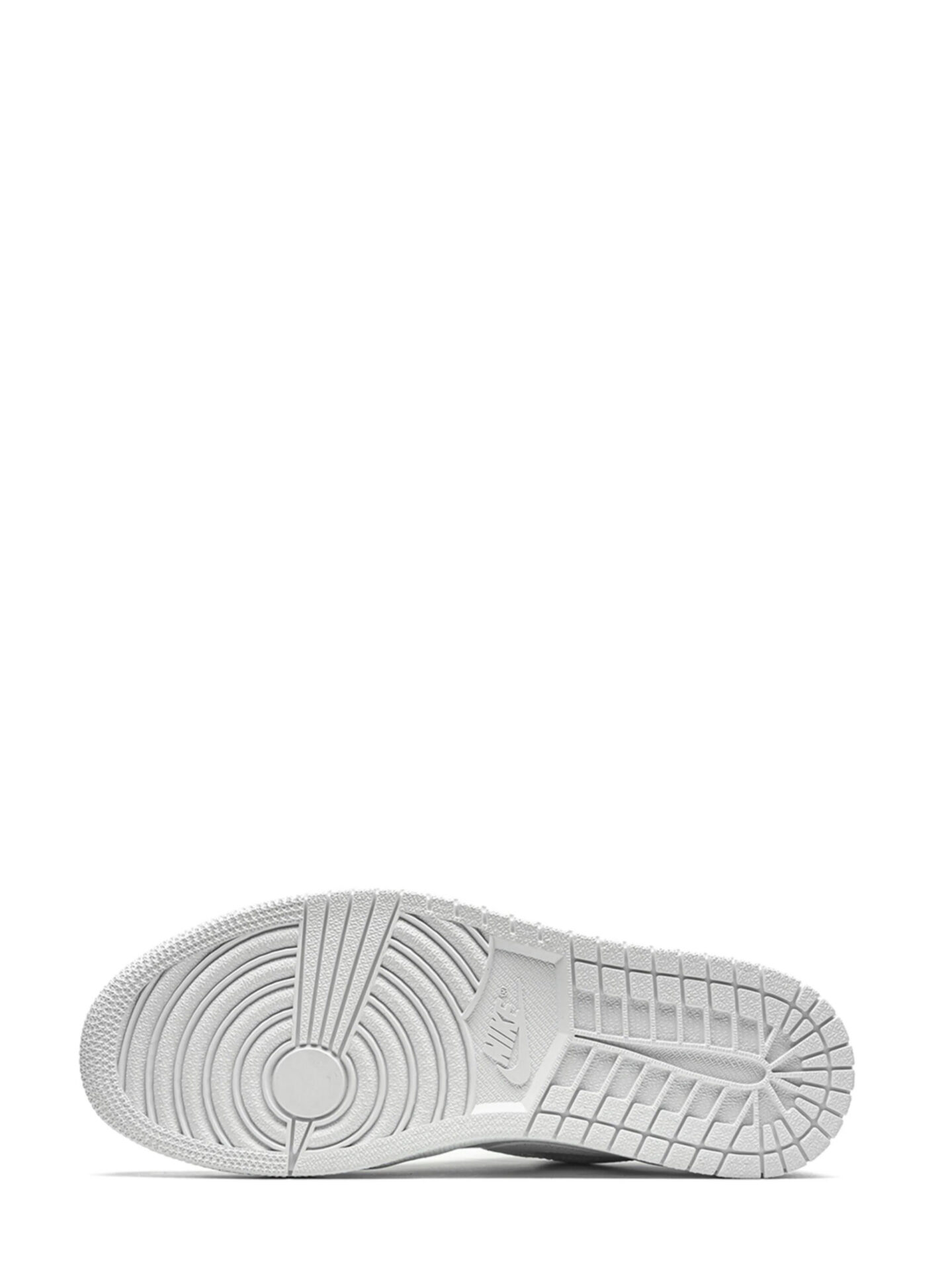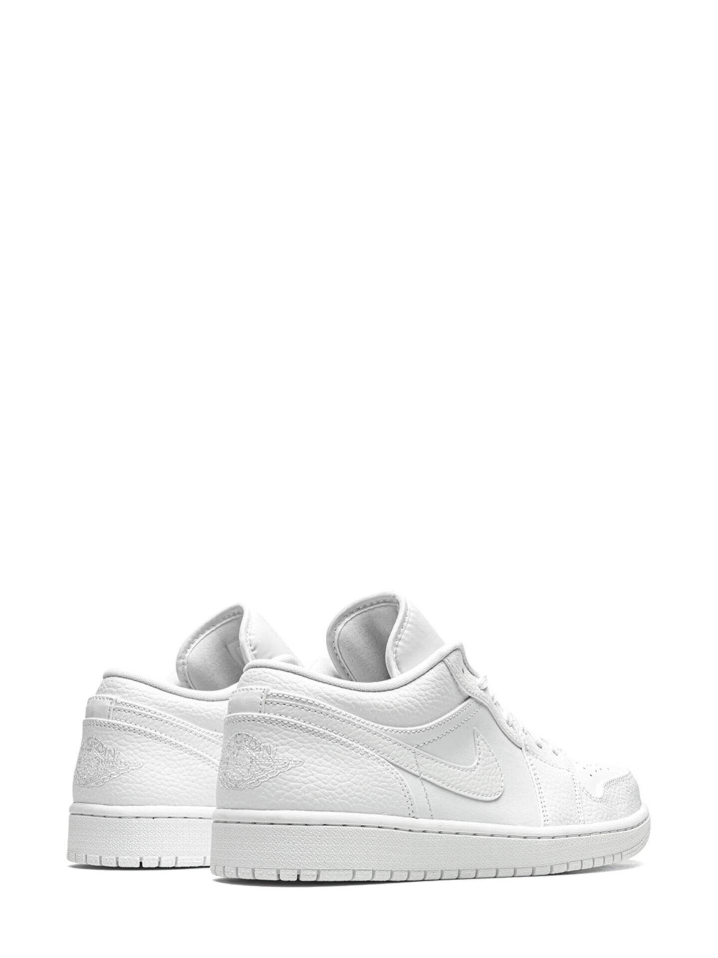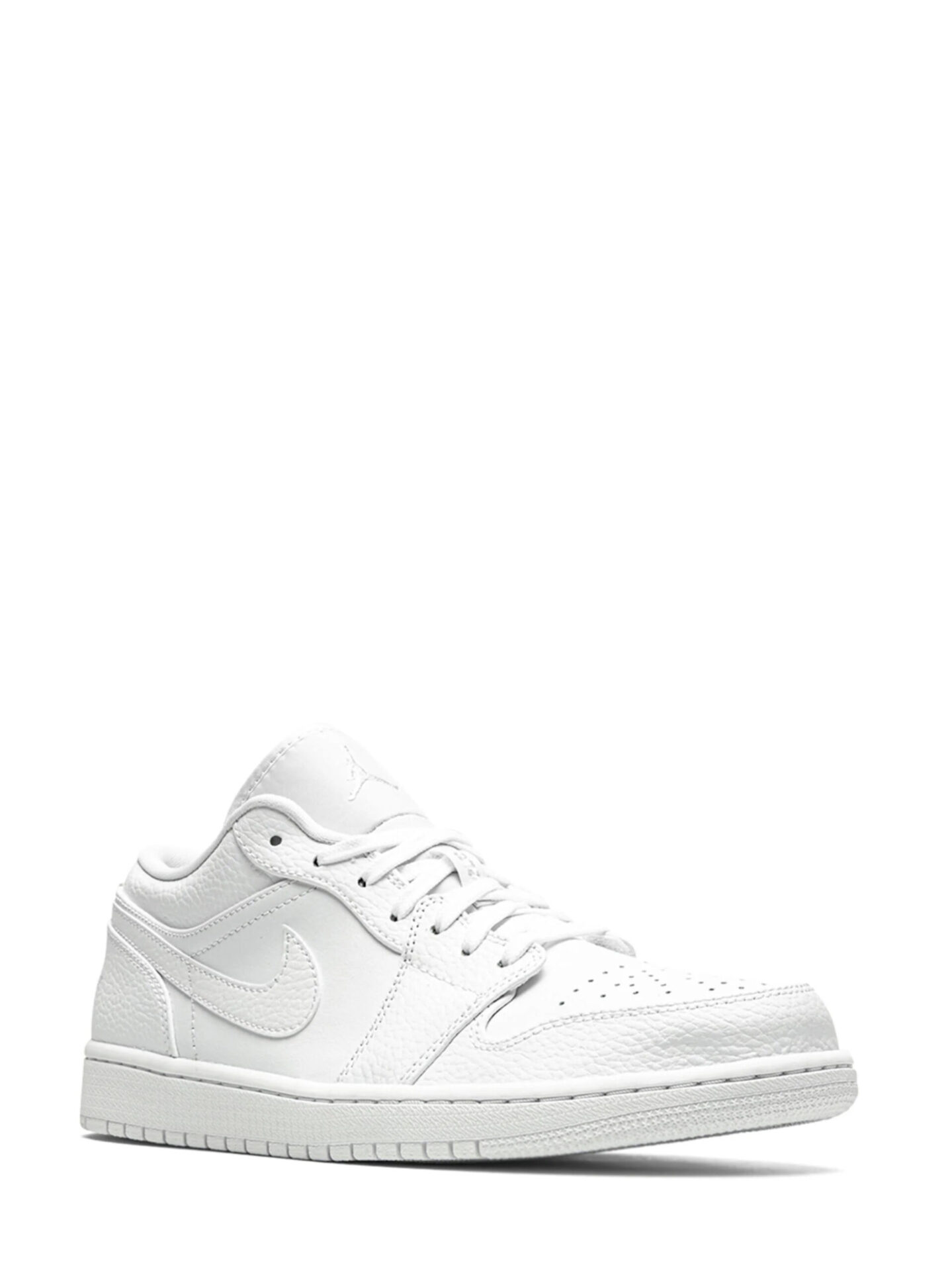 The smooth white leather upper of this Low Air Jordan 1 has perforations in the toe box, white leather overlays, and a white leather Swoosh. This sneaker also features a white rubber cupsole and an Air-sole unit in the heel. A white debossed Jumpman appears on the white padded tongue, a black Jumpman boasts on the white insole, and an embroidered white Wings logo is displayed on the white heel.