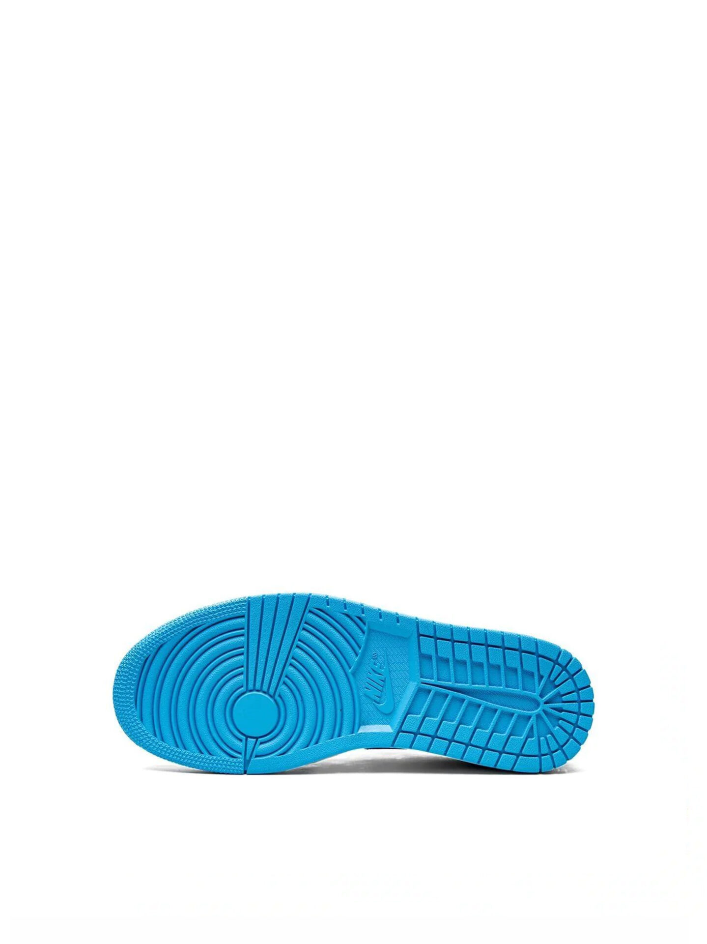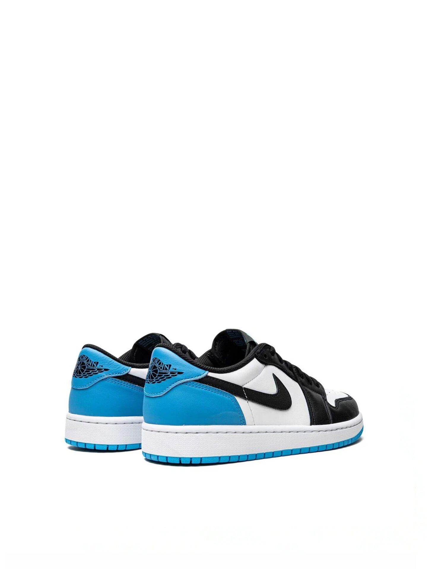 The Air Jordan 1 Retro OG Low UNC Powder Blue arrives with a white leather upper with contrasting black overlays and a University blue Swoosh. This sneaker comes in a combination of white, dark powder blue, and black hues.
