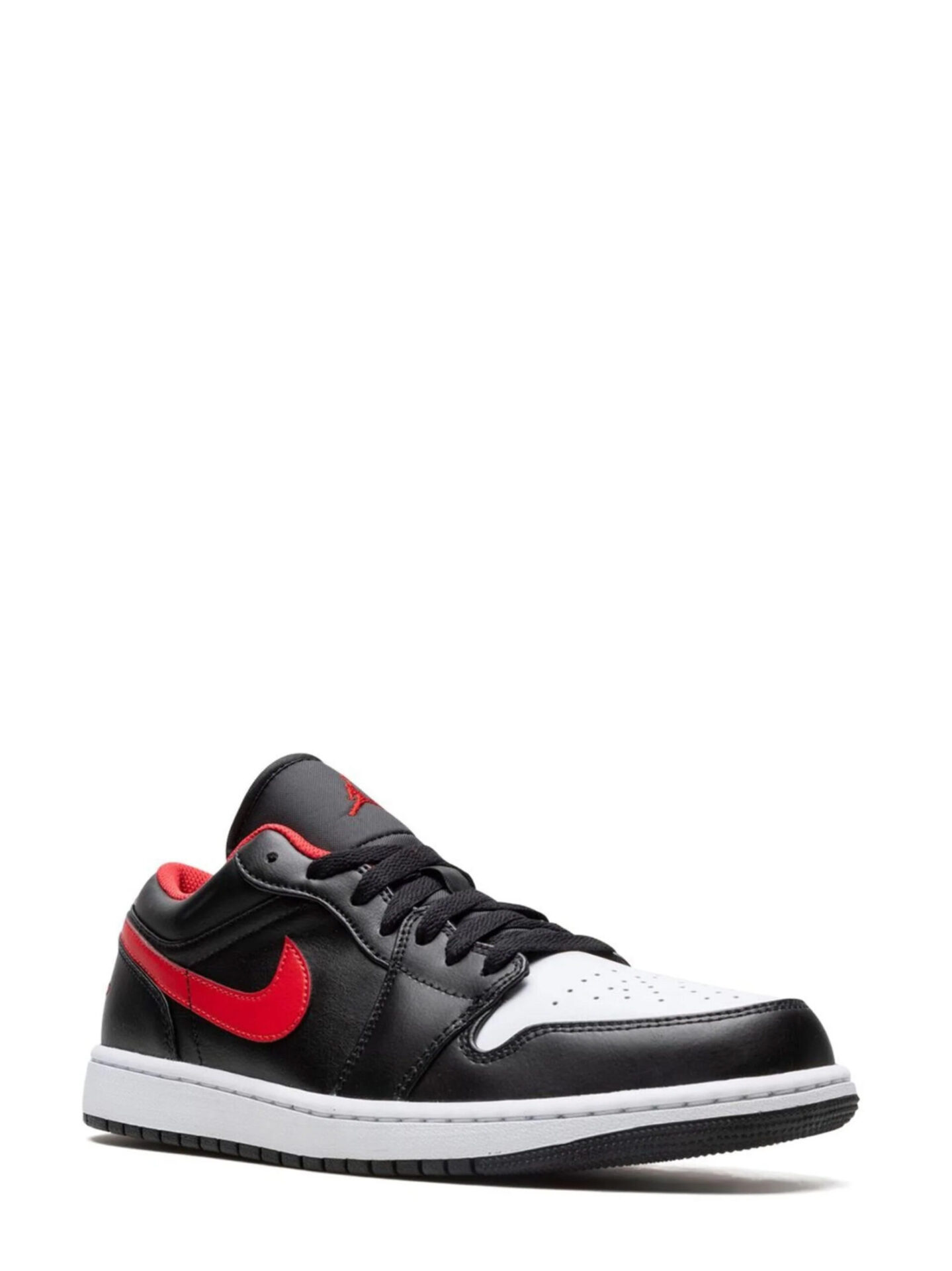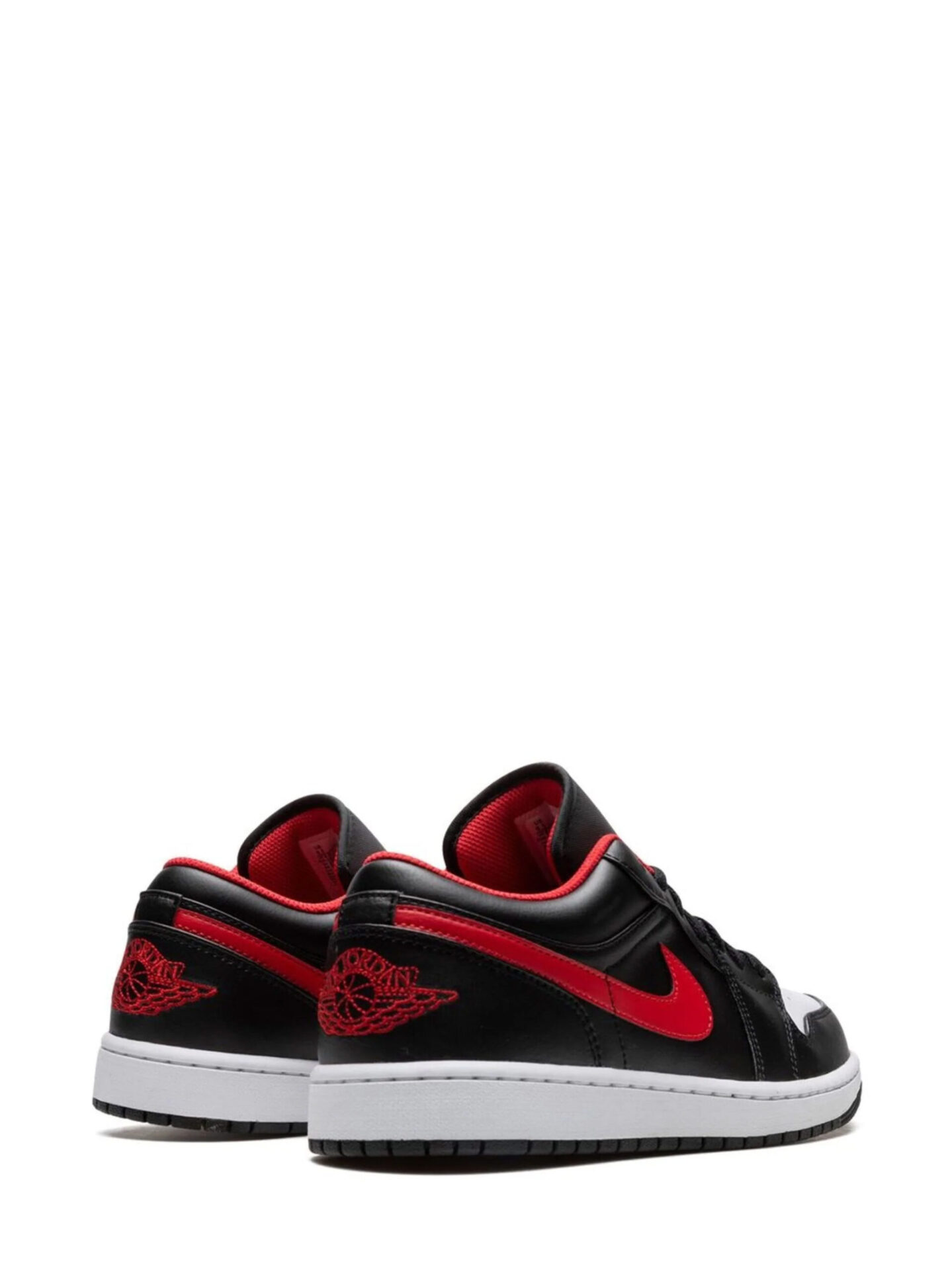 White leather was used to design the perforated toe box. Except for the Fire Red leather Swoosh, the upper’s remaining portions are covered in Black leather. On the heel, there is a stitched “Wings” emblem, while the tongue’s black nylon is stitched with a red Jumpman. A black rubber outsole with a linear pattern for traction and a white midsole round out the shoe.