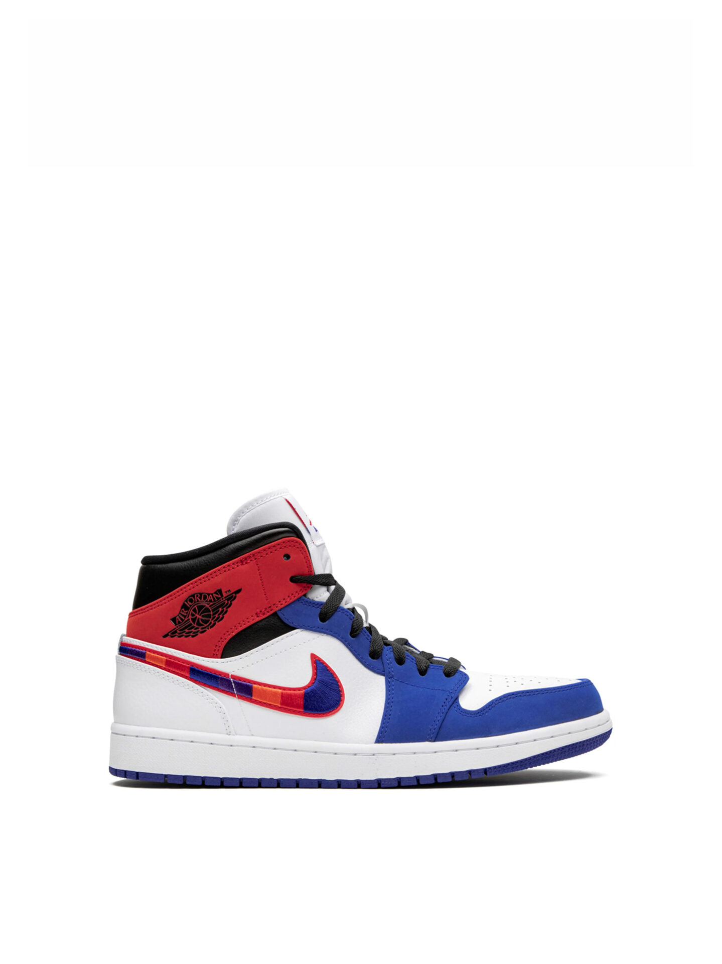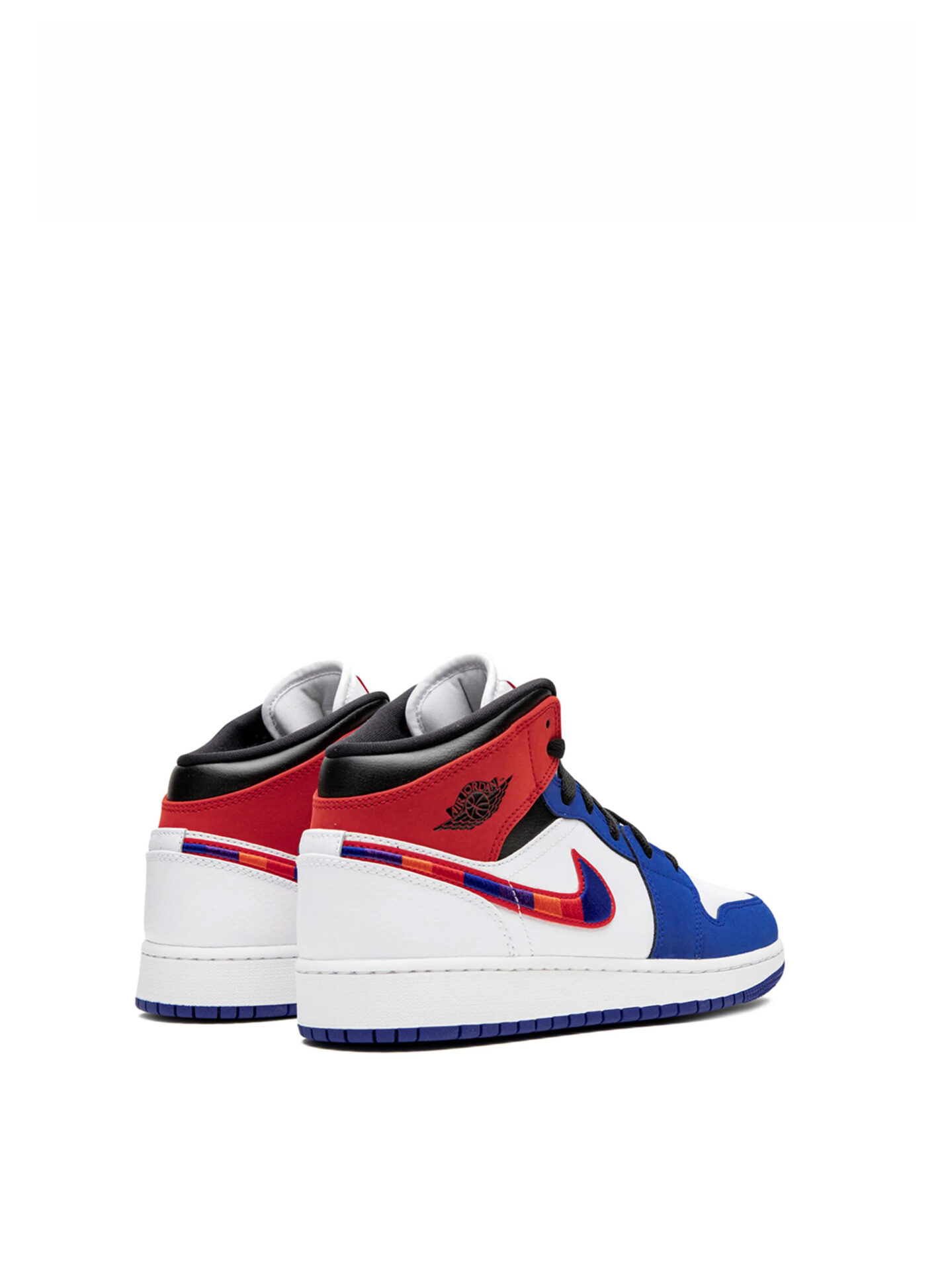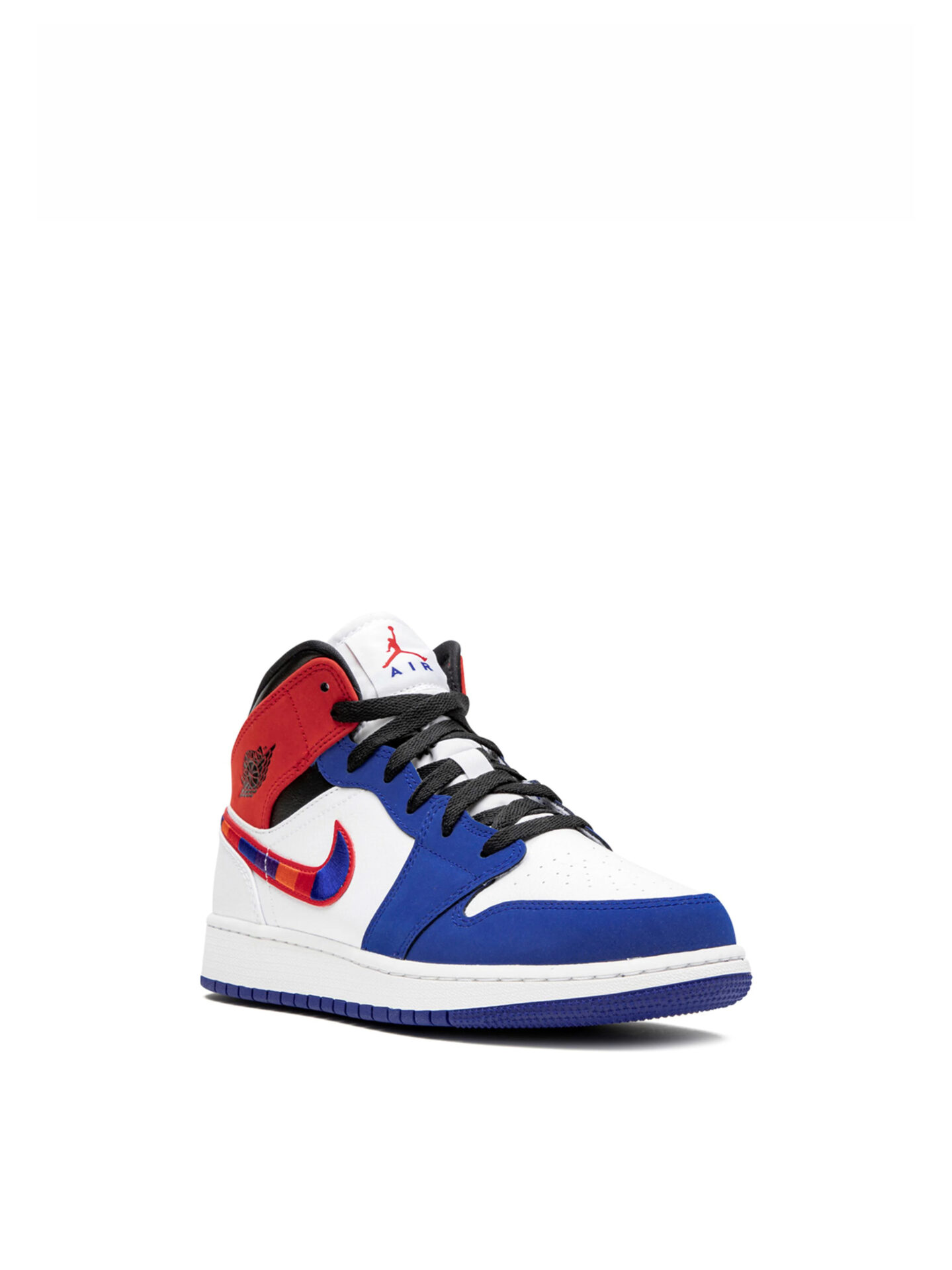 The Rush Blue University Red GS Air Jordan 1 Mid features a combination of Rush Blue, University Red, Black, and White colors. The upper is made of durable leather and is predominantly white. The Jumpman logo features on the tongue and the University Red accents appear on the Swoosh and on the side next to the collar. The collar is padded and the midsole incorporates the Nike Air unit to provide extra cushioning for the feet. The outsole is made out of durable rubber with a circular traction pattern. This helps to provide excellent grip and traction on a variety of surfaces.