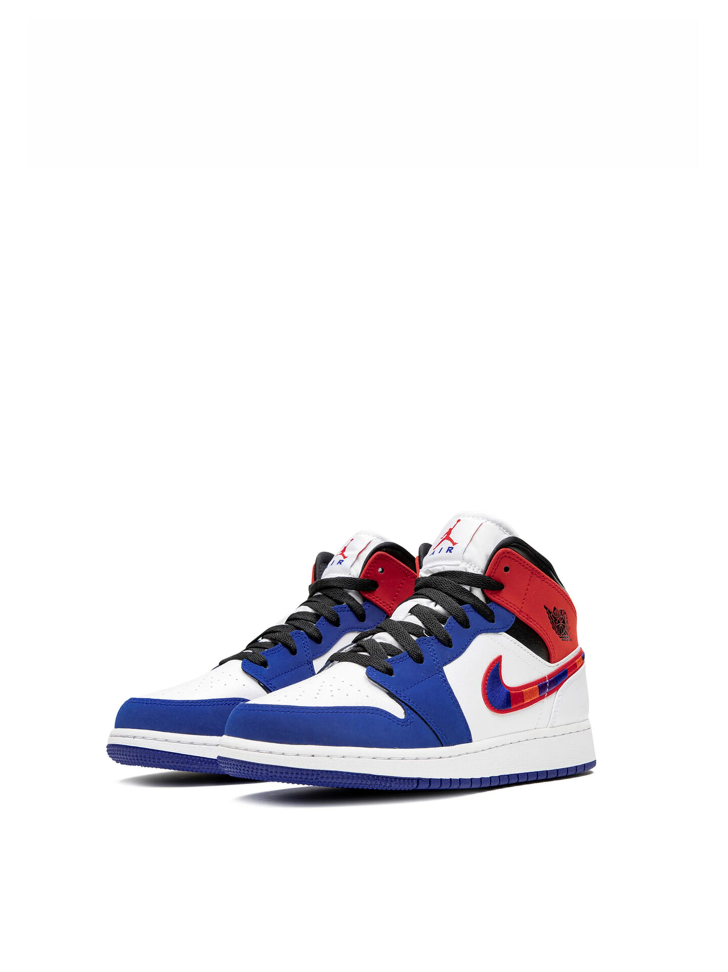 The Rush Blue University Red GS Air Jordan 1 Mid features a combination of Rush Blue, University Red, Black, and White colors.
