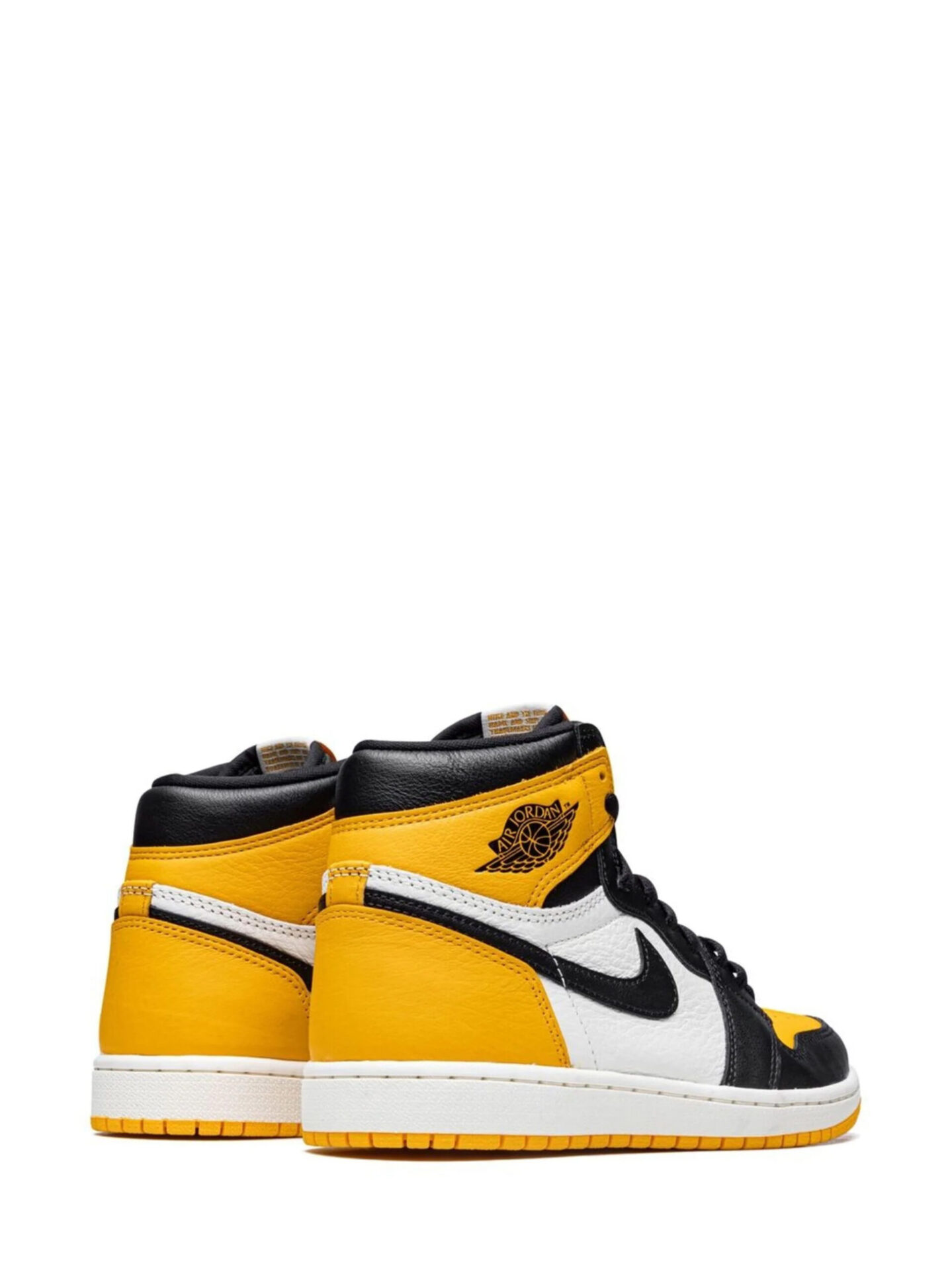 The Air Jordan 1 is a color-block mix of Taxi yellow, black, and white, bringing out the aesthetic property of this footwear. The sneaker features yellow and black overlays with white leather uppers. The uniqueness of this silhouette is in the black midfoot Swooshes, the black laces, matching nylon tongues with Jumpman motifs, embroidered Wings rear motifs, and printed insoles. The white midsoles contrasting with yellow rubber outsoles complete the look. The shoe has ankle protection for maximum support and comfort.