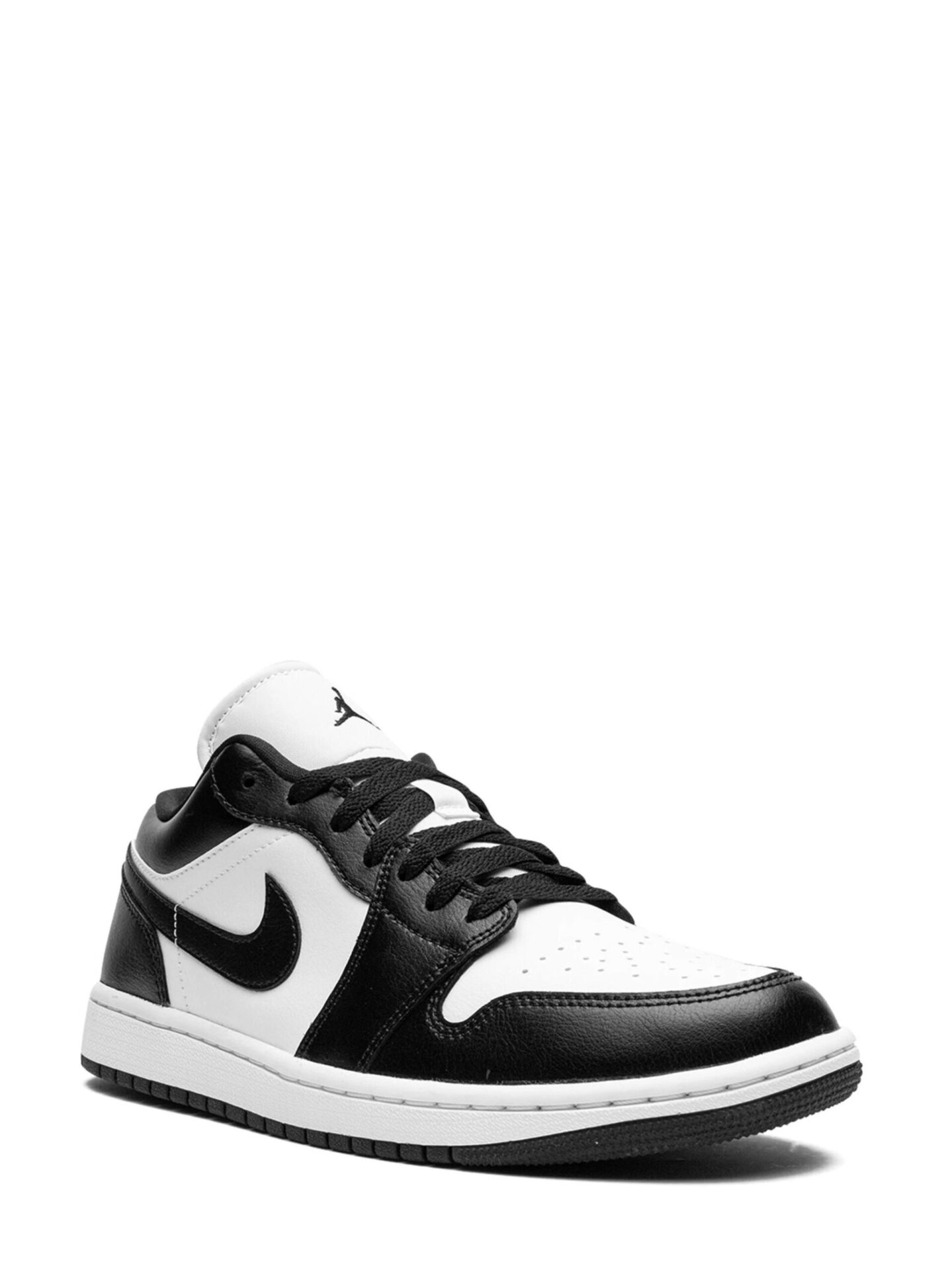 The Air Jordan 1 Panda Low (2023) (W) arrives in a white, black, and white color palette.