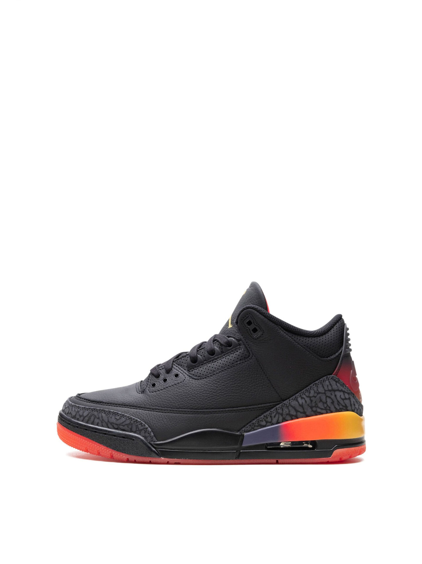 The Jordan 3 Retro J Balvin Rio perfectly blends the classic Jordan 3 design with J Balvin’s signature flair. Featuring a predominantly black upper, this sneaker is brought to life with solar flare and total crimson abyss accents that capture the vibrant energy of J Balvin’s music. The iconic elephant print on the heel and toe areas pays homage to the original Jordan 3 design, while the gradient midsole transitioning from bright orange to deep abyss adds a unique and colorful twist.