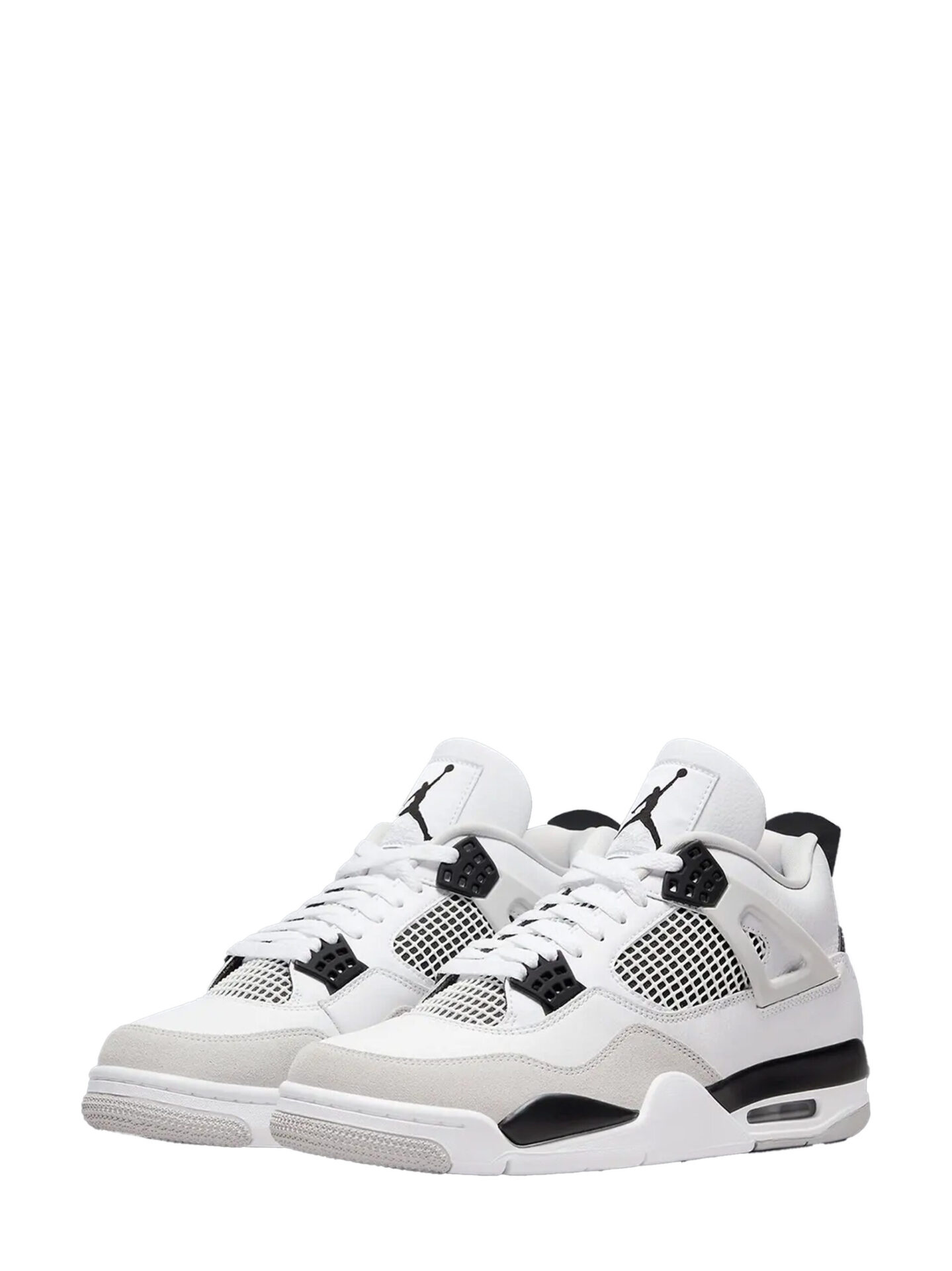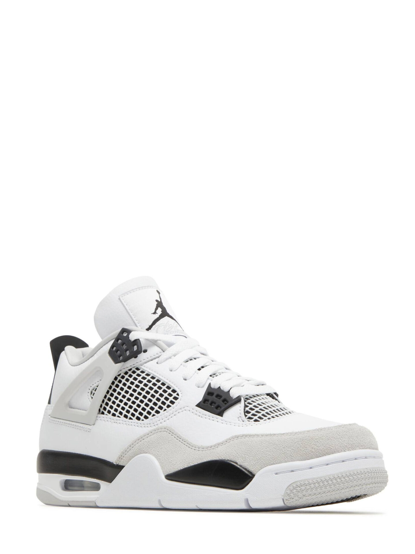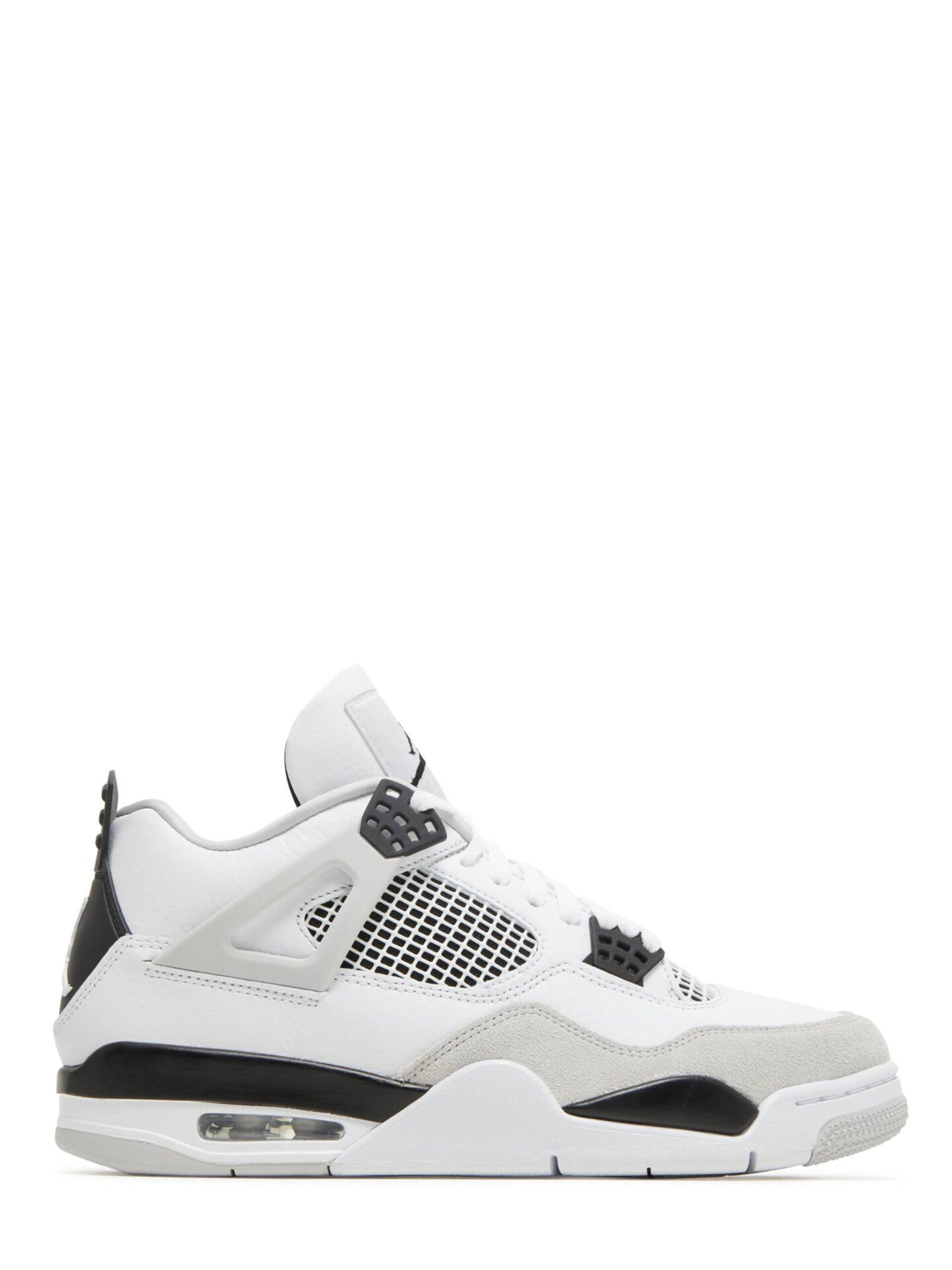Pulling its color-blocked style from the Air Jordan 4 Military Blue, the Air Jordan 4 Black Military features a smooth white leather upper with a light grey Durabuck toe wrap and netted TPU inserts. Military Black eyelets, heel tabs, and underlays add a stark contrast to the upper. At the base, a white, black, and light grey sole with a visible Air unit completes the design.