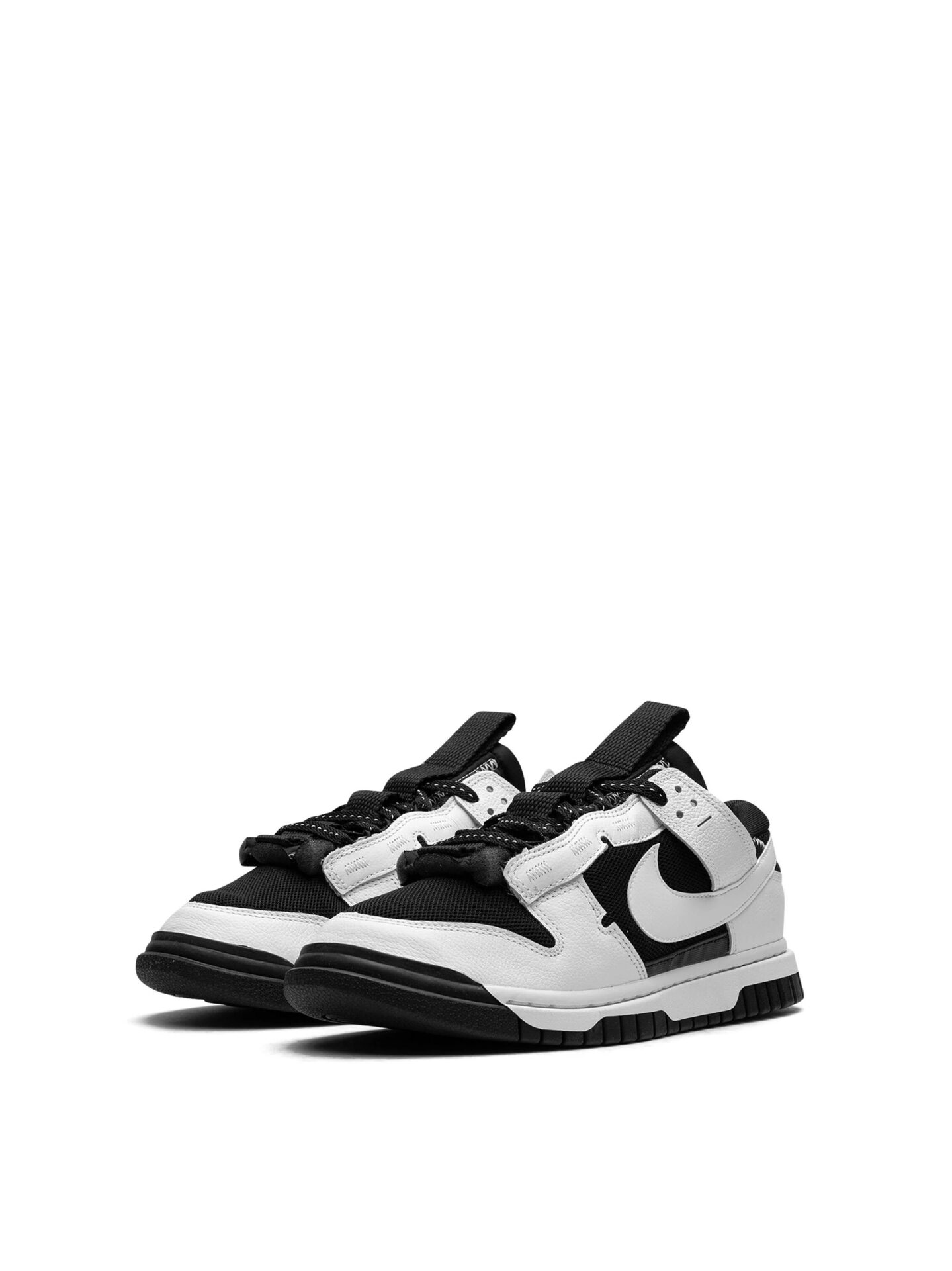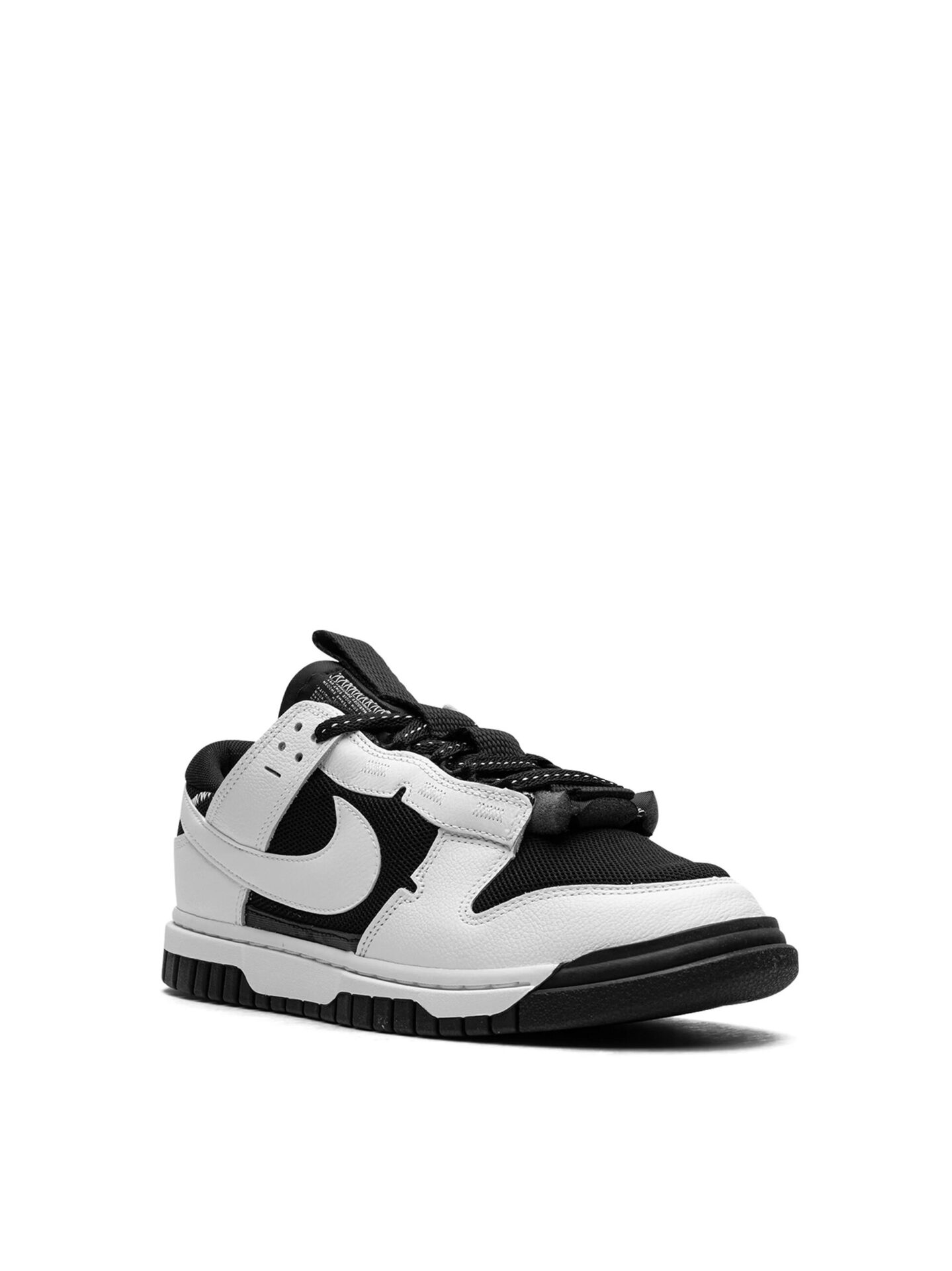 The Reverse Panda Nike Dunk Low Jumbo textile base layers sport a predominantly black tone, while the textured leather overlays starkly contrast in Crisp White. These overlays extend to elongated panels on the tongue. The mesh base and padded tongue have a Sleek Black finish, while the leather overlays and Swooshes come to life in bright white. Various accents of contrast stitching in white, including on the standard black laces, add subtle detail. Below, the sole unit undergoes modifications, with added reinforcement at the toe and a distinct traction pattern.