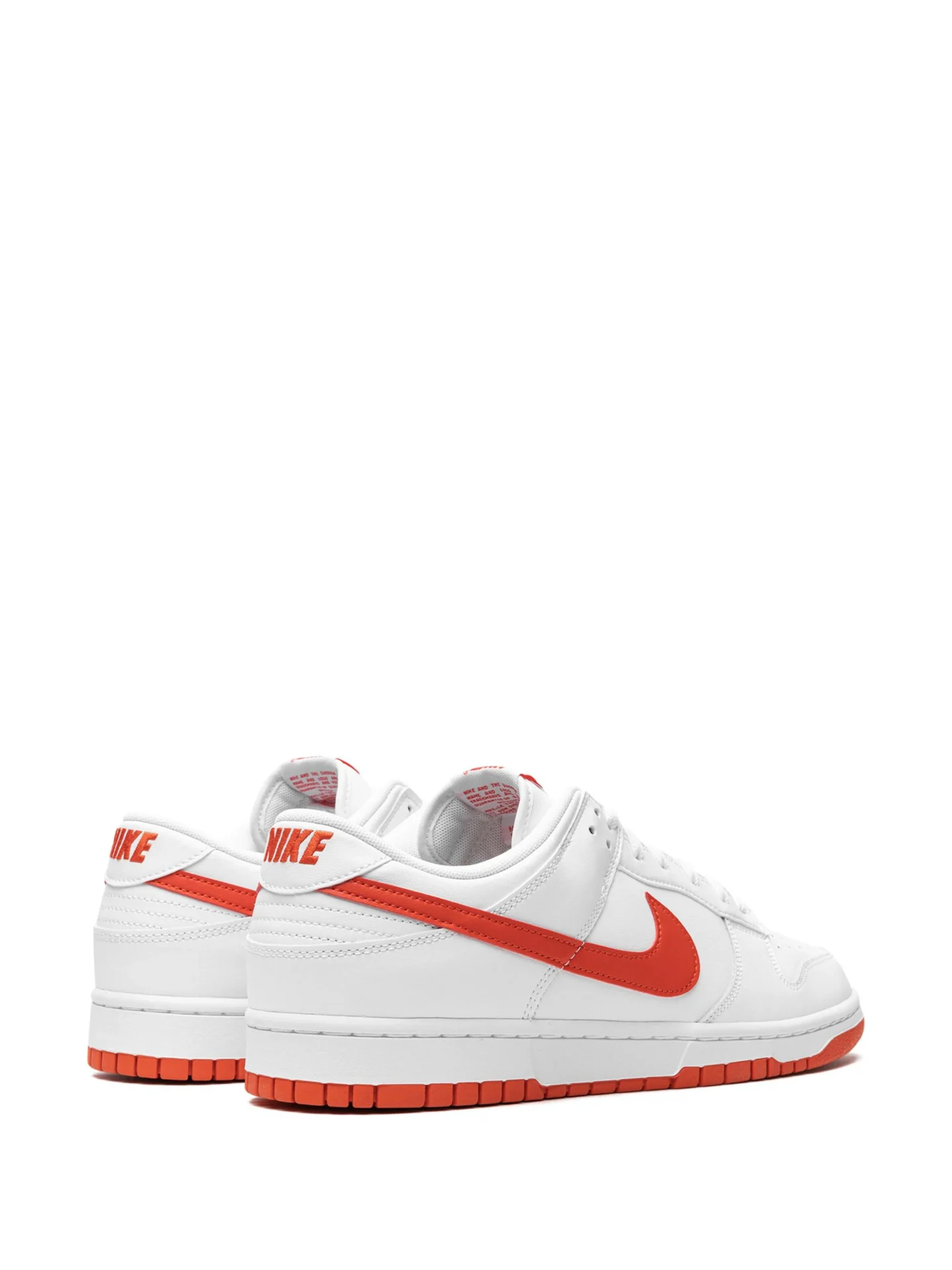 The Low Retro Dunk in White and Picante Red has a bright red gum rubber sole that is directly below the white rubber midsole. On top of the midsole is the white body that is made of leather and various leather overlays. The Nike ‘Swoosh’ symbol is bright red, as well as the ‘Nike’ that is embroidered on the back of the shoe.