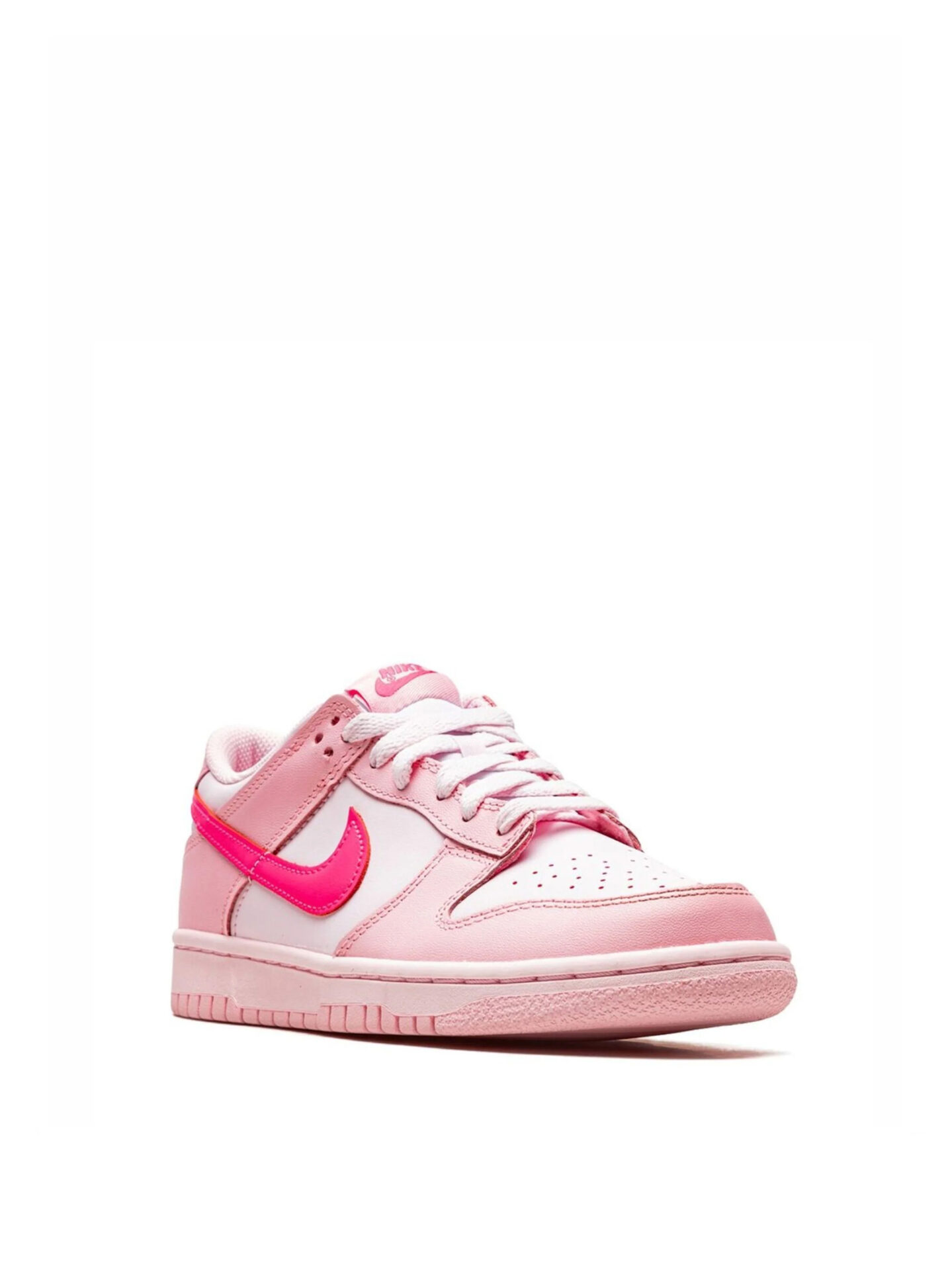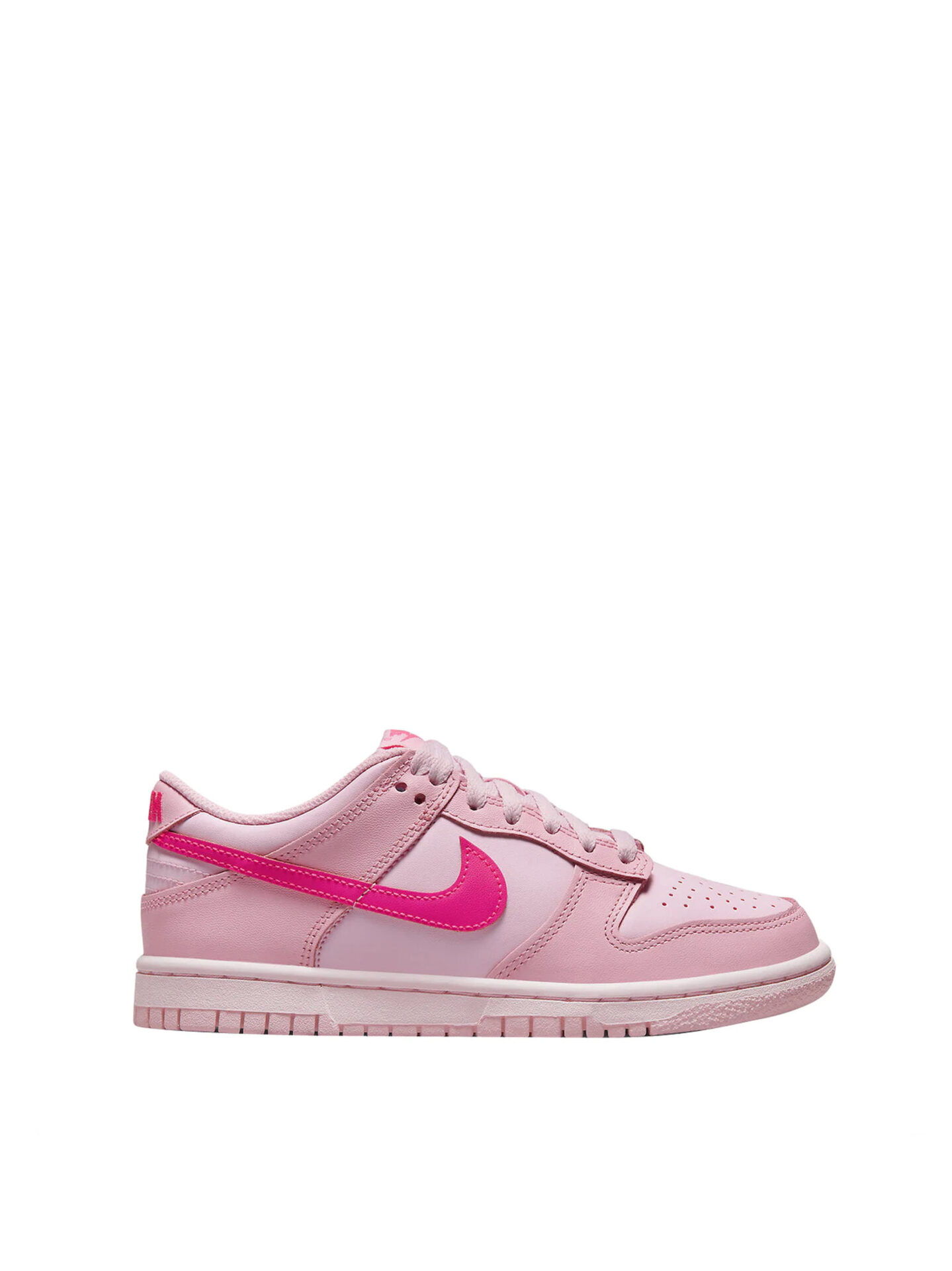 The look is completed by the Nike Swoosh in a bold pink that provides a strong contrast and stands out noticeably on the shoe. In addition to the Swoosh on both sides, the Nike Dunk Low Triple Pink (Grade School) features Nike branding on the sole, heel, tongue, and inner sole. This shoe comes in Grade School (GS) sizing.