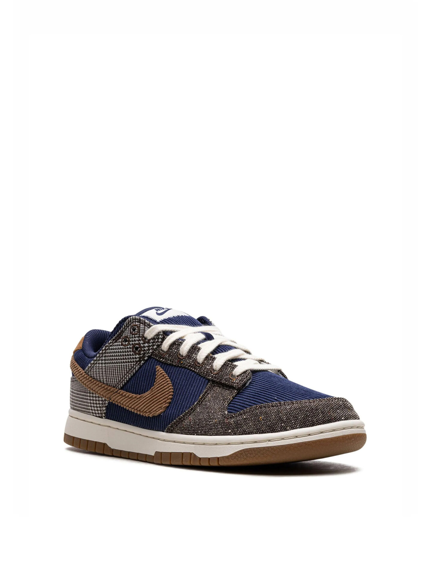 The Tweed Midnight Navy Corduroy iteration of the Nike Dunk Low-Top features an upper with a base of navy corduroy. It is overlaid on the toe and eye stays with woolen-speckled brown tweed. The collar and heel are overlaid with brown plaid tweed. The side panel Nike swoosh is caramel-colored corduroy that matches the tumbled leather heel tab. The tongue and sock liner are also navy corduroy and match the insole with crisp white Nike branding. Blue Nike branding appears on the crisp white tongue tag. The outsole is gum rubber with a pattern for traction and absorbing impact.